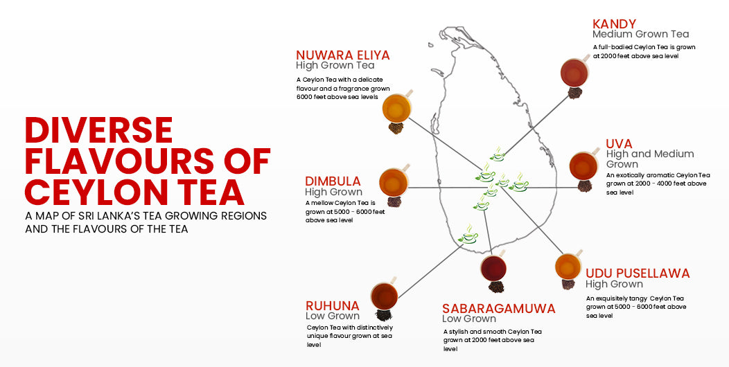 在斯里兰卡,中部和南部省份生产大部分茶叶。不同的海拔和微气候会影响锡兰茶的独特风味、颜色、香气和季节性。