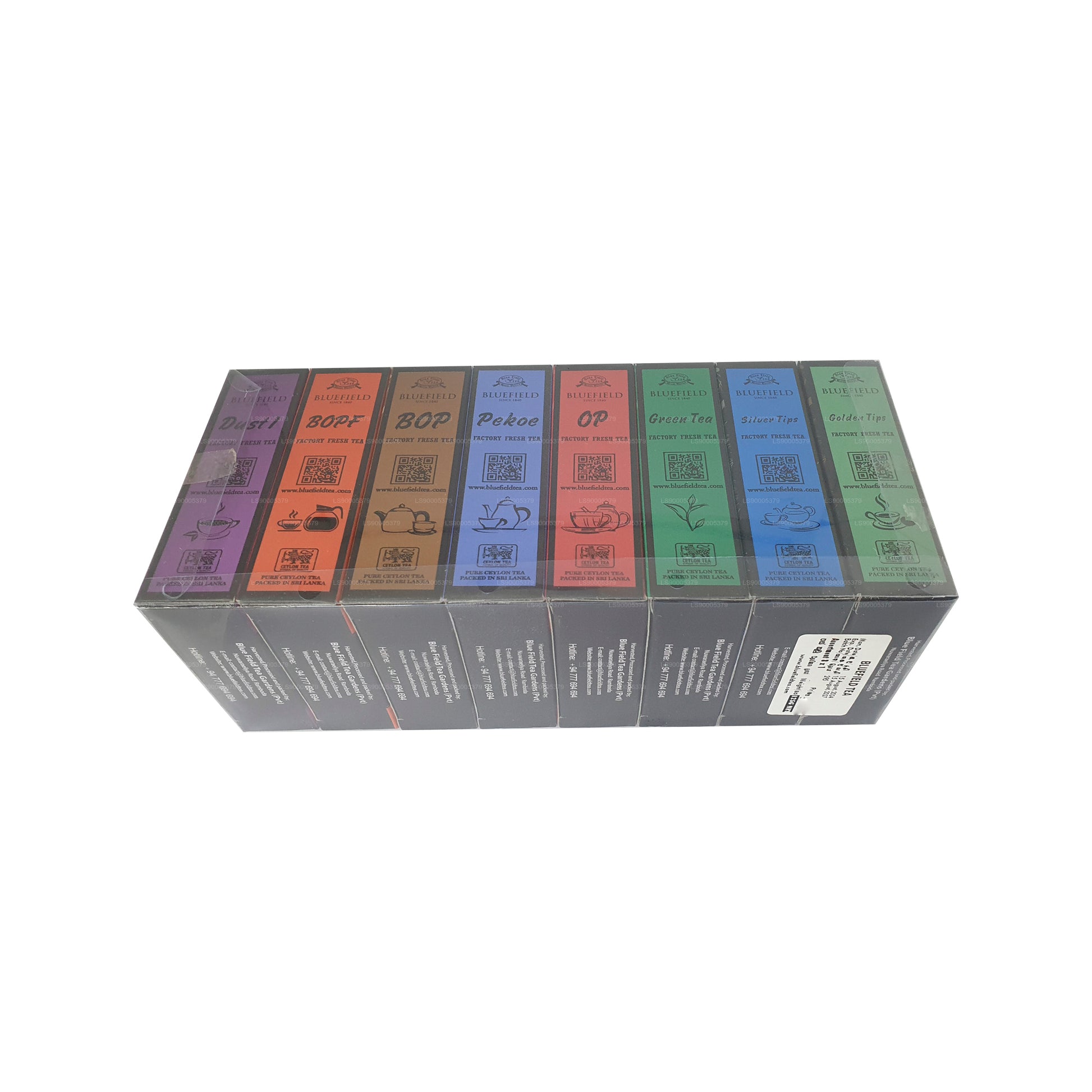 The Bluefield Tea 8 in 1 Tea Collection showcases a diverse range of Sri Lankan teas, including DUST NO 01, BOPF, BOP, PEKOE, OP, Green Tea, Silver Tips, and Golden Tips. Each variety represents distinct processing styles and flavor profiles, from the robust full-bodied BOPF and BOP to the delicate and subtly sweet Silver and Golden Tips, and the fresh vegetal notes of Green Tea. Packaged elegantly, this collection offers tea enthusiasts a comprehensive exploration of traditional and specialty teas, making it an ideal gift or a personal treasure for sampling Sri Lanka's finest.