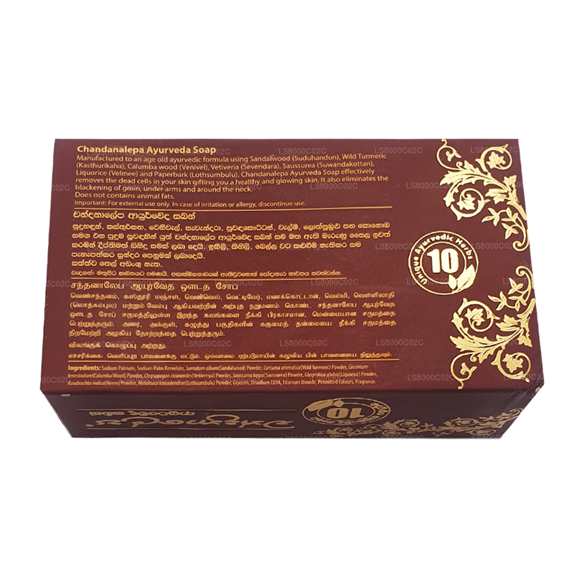 Chandanalepa 阿育吠陀香皂是一款高端的全自然草本香皂,专为滋养和保护肌肤而设计。采用经过时间验证的阿育吠陀成分的混合,这款香皂通过增强免疫力和改善皮肤健康,提供自然的护肤效果。它不含有害的毒素和化学物质,包含檀香木、Suwanda Kottan、Lothsumbulu、Kasthurika、Weniwel、Velmi和Savandara,这些成分都因其药用特性而闻名。通过协同作用,这些成分提供年轻、光滑的皮肤,同时保护肌肤免受环境压力,促进健康肤色。Chandanalepa阿育吠陀香皂是回归皇家美丽习惯,提供真正奢华的护肤体验。