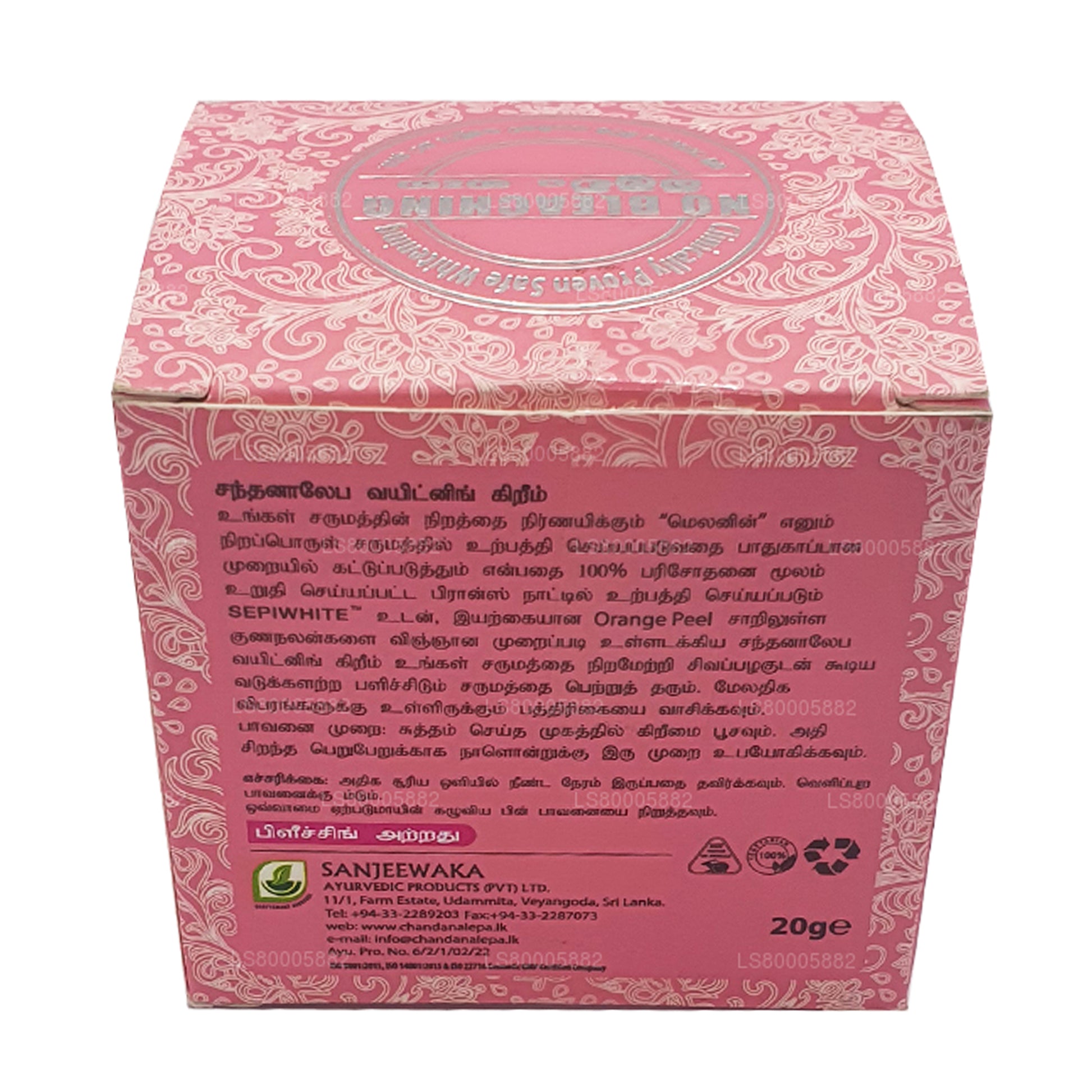 (SKU:LS80005882)Chandanalepa美白霜采用科学制成,将法国先进的化妆品成分SEP IWHITE TM与天然橙皮相结合,通过安全控制帮助形成肤色的 “黑色素” 来确保皮肤明显美白。这款独特的产品将显著去除黑斑和瑕疵,赋予您容光焕发的肌肤。