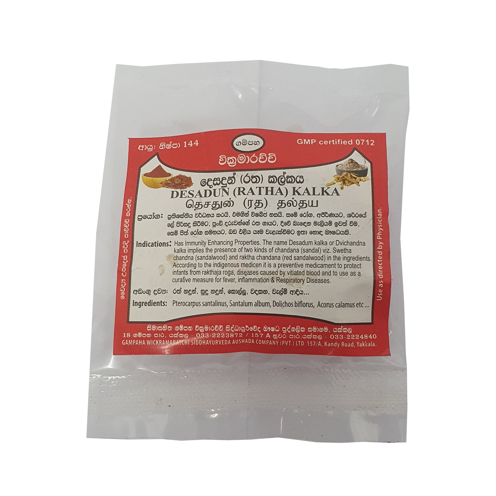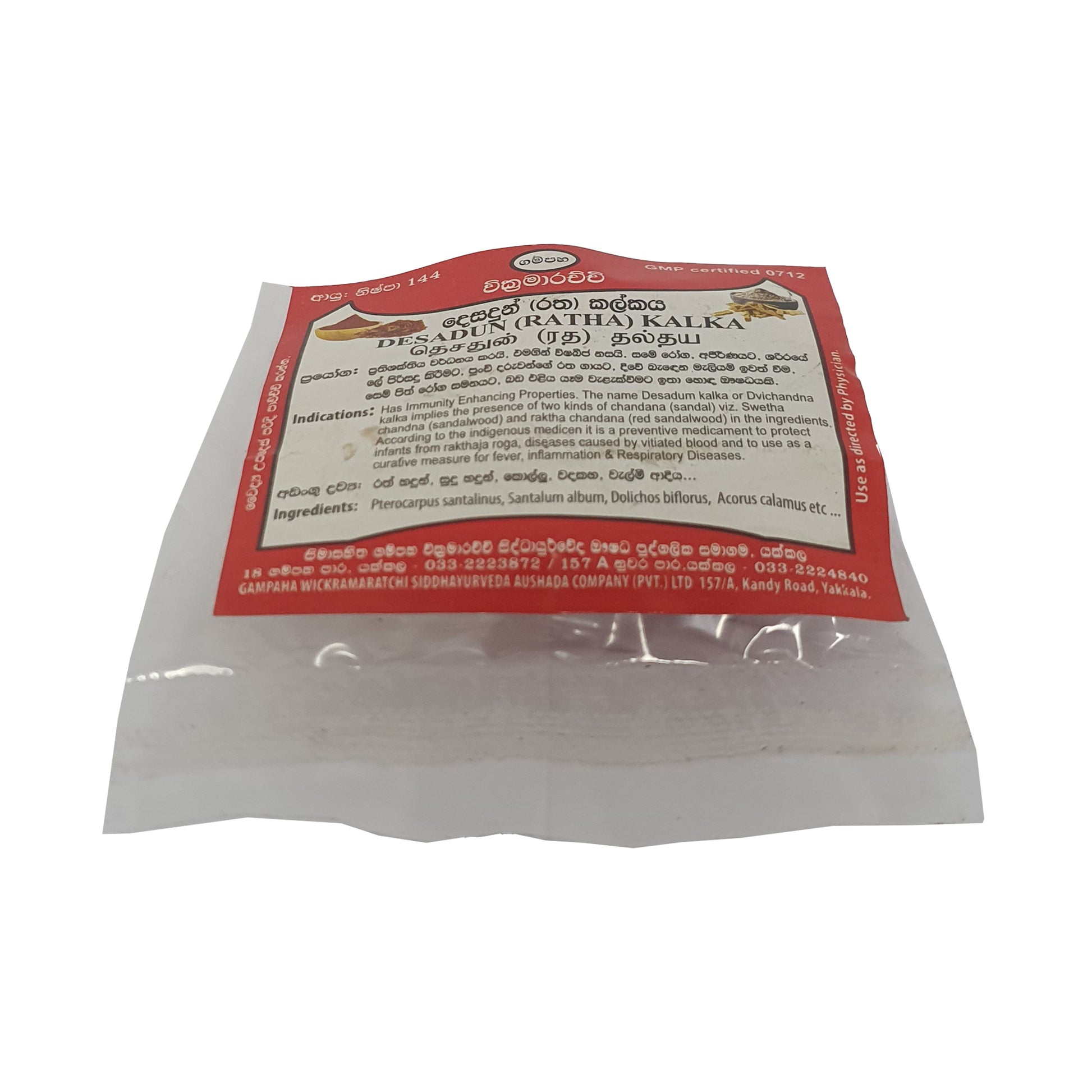 甘帕哈·维克拉马拉奇·德萨顿·卡尔卡(拉塔卡尔卡)是一种传统药用混合物,含有白檀和红檀,以增强免疫力而闻名。它主要用于传统医学,预防婴幼儿血液疾病,并治疗肝脏疾病、炎症和呼吸系统疾病。这种具有双重功效的药物因其在传统健康实践中天然有效的治疗方案而备受推崇。