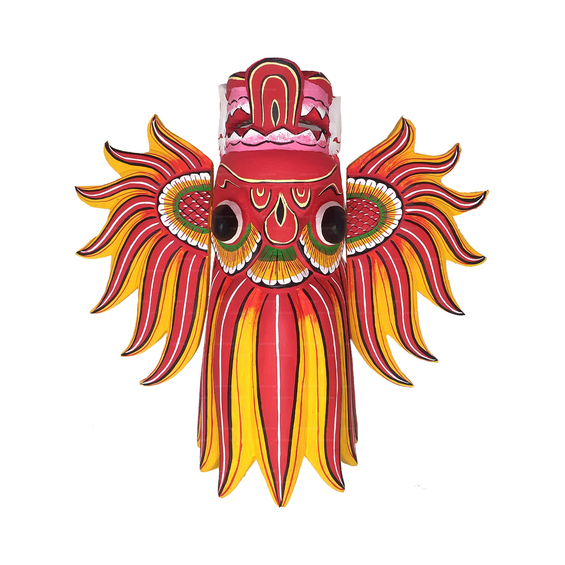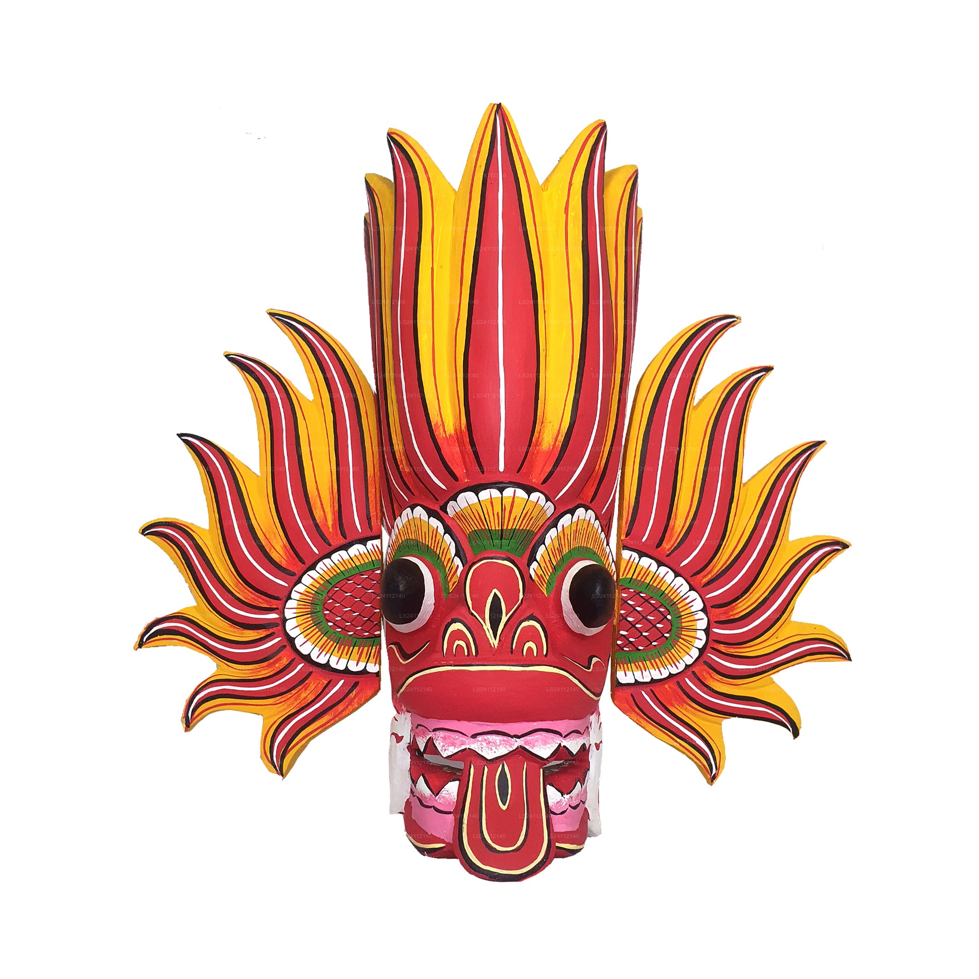 The "Raksha" mask is a traditional mask from Sri Lanka, often used in traditional dance performances and rituals. It represents a demon character with bulging eyes, protruding tongue, and fearsome expressions. These masks play a significant role in Sri Lankan culture, symbolizing protection against evil spirits and bringing blessings to the community.