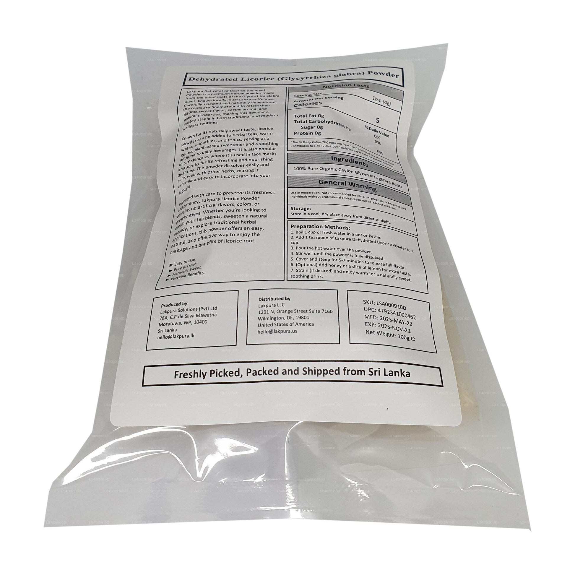 Lakpura® Dehydrated Licorice (Velmee) Powder is a finely ground herbal powder made from high-quality licorice roots, known for its sweet, soothing flavor and therapeutic properties. Rich in antioxidants, this powder is widely used in traditional medicine to support digestive health, alleviate sore throats, and reduce inflammation. It is ideal for making herbal teas, tonics, or adding to various wellness recipes. The powder is also known to help balance the body’s systems and support respiratory health. With its natural, herbal benefits, Lakpura® Dehydrated Licorice Powder offers a convenient way to incorporate licorice into your daily routine for overall wellness.