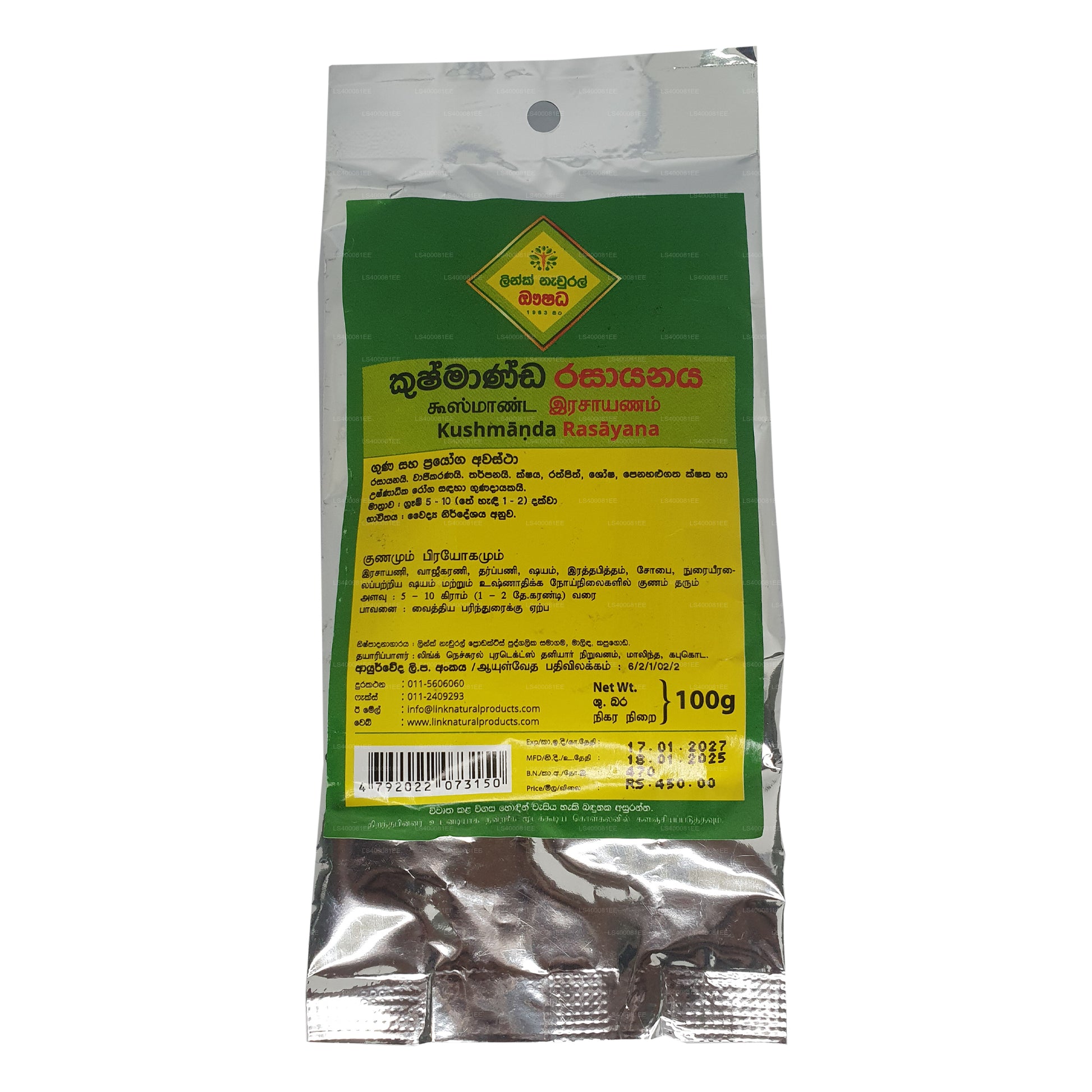 (SKU:LS4000664C)Link Kushmanda Rasayana 是一种传统的阿育吠陀配方,因其恢复活力和营养特性而备受推崇。这种草药制剂由库什曼达(也称为灰瓜或冬瓜)的提取物以及其他强效草药和天然成分制成,以其增强活力和促进整体健康和福祉的能力而闻名。据信,Kushmanda Rasayana可以滋养身体,增强免疫系统并支持健康的新陈代谢。通常建议希望提高能量水平、改善消化和保持最佳健康状况的人士使用。此外,作为均衡生活方式的一部分,定期食用它可能有助于平衡剂量并延长寿命
