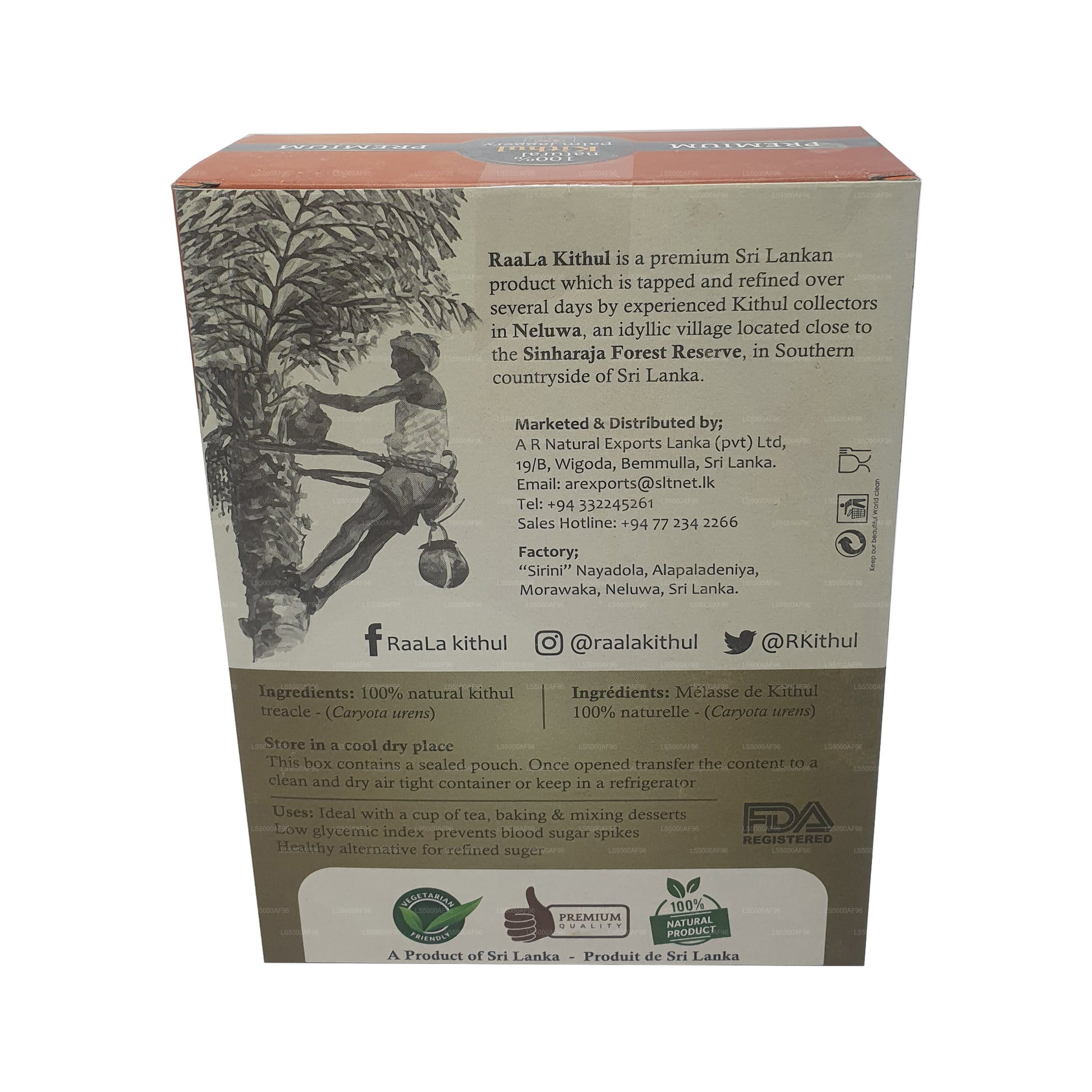 Raala Kithul is a premium Sri Lankan product which is tapped and refined over several days by experienced kithul collectors in Neluwa, an idyllic village located close to the Sinharaja Rain Forest Reserve, in Southern countryside of Sri Lanka. Raala Kithul contains no added sugar or water.