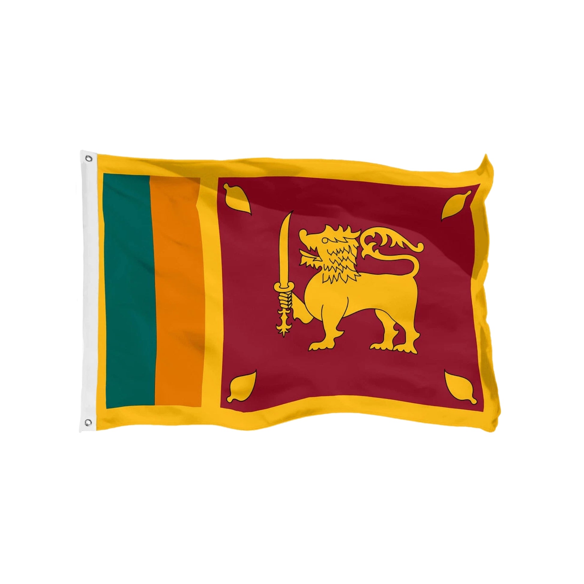 (SKU:LS200060B4)旗帜紫色背景上的金狮在右前腿拿着一把剑(锡兰卡斯塔尼剑),可以看见它漂浮着,他的身体朝着旗杆一侧。在纹章学中,它被称为 “过往的狮子”。这个标志是康提国王的古代象征(位于岛屿中心的城市,在16至19世纪是古老的康提王国)。这种图案是与佛教(斯里兰卡的主要宗教)相关的象征。它实际上代表了该国占多数的僧伽罗人口。狮子之剑唤起了主权国家。