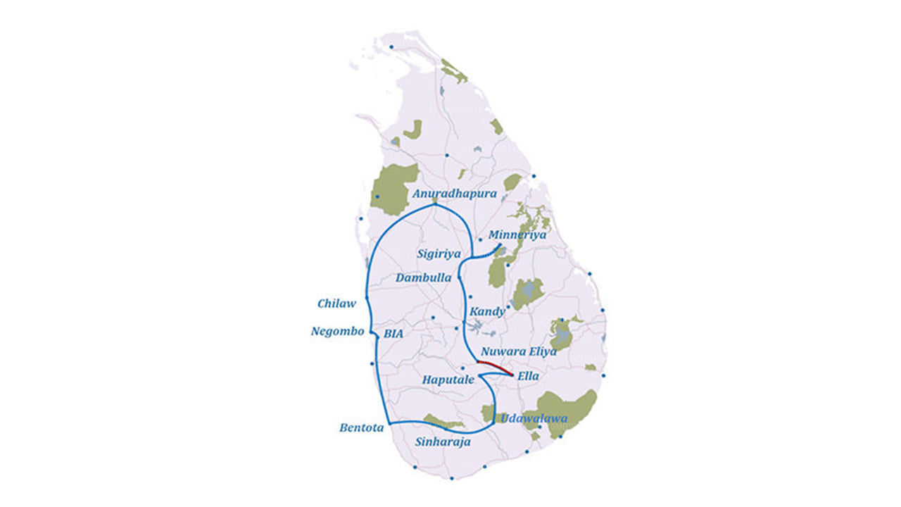 An island blessed with enchanting natural beauty and many ancient temples that were built during the prosperous era where kings ruled and religious grandeur was part and parcel of ruling the nation. This tour takes you from Negombo to Sigiriya where you can explore the ancient city of Anuradhapura, the rock fortress, Dambulla Cave Temple and then head to Kandy to visit the many sites there. We explore the hill country by visiting Nuwara Eliya, Ella and Haputale while a scenic train journey takes you from Nanu Oya to Ella. Enjoy safaris at Minneriya and Udawalawe National Parks and explore and hike the Sinharaja Rain Forest Reserve. In Bentota, you can enjoy a river safari and visit a turtle hatchery.