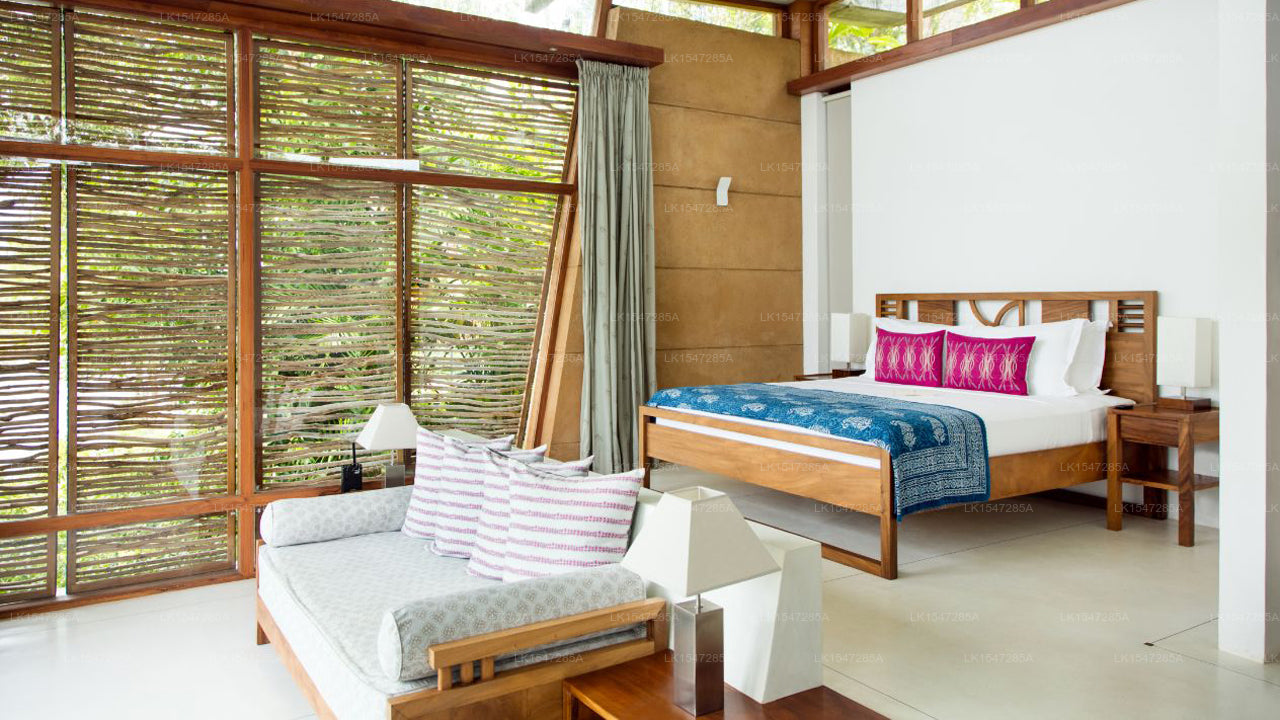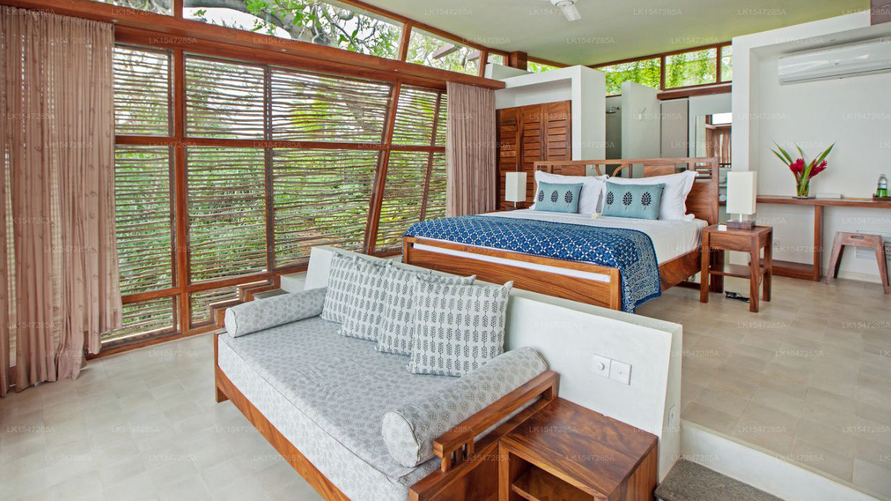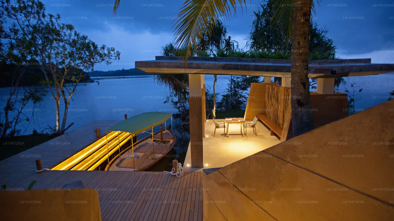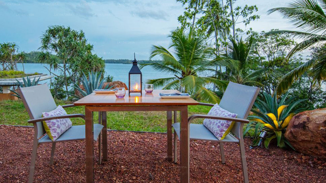 The resort features elegantly designed villas and suites that embrace eco-conscious luxury. Each unit includes plush bedding, en-suite bathrooms, floor-to-ceiling windows, and private terraces offering panoramic views of Koggala Lake and the lush tropical surroundings.